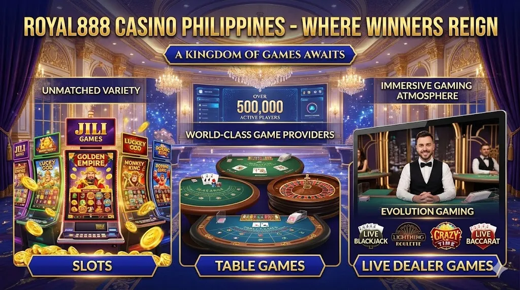 Royal888 offers a diverse selection including slots, live dealer tables, and card games from providers like Jili Games and Evolution Gaming.